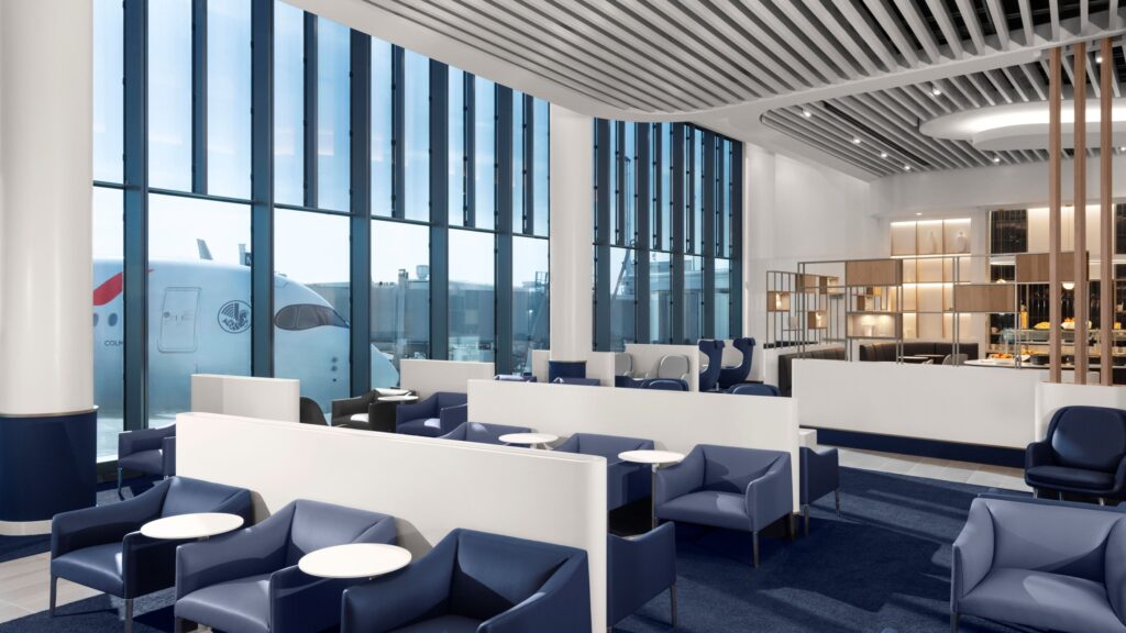 Designed by Air France teams in collaboration with SGK Brandimage, the lounge combines French elegance with modern design principles and natural light. The shades of blue, luminous whites, and touches of red create a refined and tranquil atmosphere.